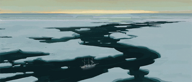 薩莎拿起祖父的探險(xiǎn)日記之后,冰層斷裂,兩個(gè)巨大的冰層逐漸遠(yuǎn)離,薩莎就這樣和祖父做了最后的道別。