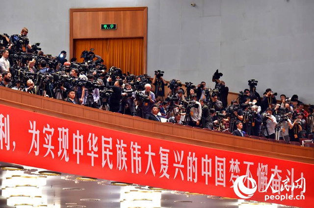 中國(guó)共產(chǎn)黨第十九次全國(guó)代表大會(huì)開(kāi)幕會(huì)現(xiàn)場(chǎng),中外記者齊聚采訪。(人民網(wǎng)記者 翁奇羽 攝)