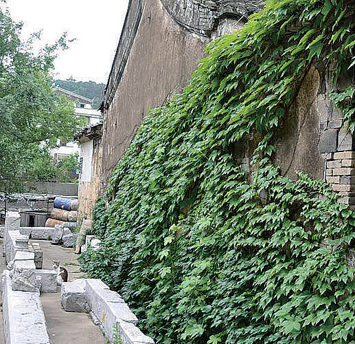 僅從外觀上就可以做出判斷,那是一幢兩進式建筑,一前一后兩個院落。外墻的墻皮早已被風雨和歲月剝蝕殆盡,磚石清晰可辨。后進院落的墻上密密麻麻的一片翠綠,好一路爬山虎。再定睛一瞅,就連那牛軛似的屋脊上,灰突突的斷瓦間,竟也生了些許潦亂而稀疏的野草。