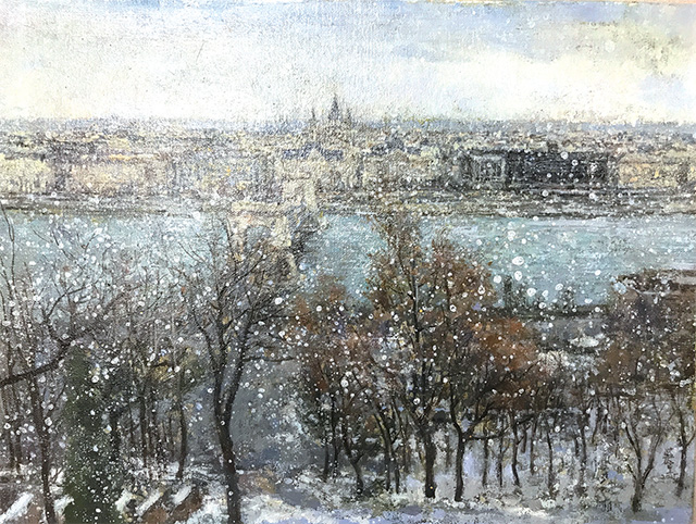 2014年春,我在北京畫院美術(shù)館初次見到了莊重的油畫作品。在他所擅長的倒影和俯瞰航拍主題作品中,最打動我的當(dāng)屬那些淡雅朦朧的倒影系列?!坝悬c兒巴比松、有點兒印象派、有點兒柯羅、有點兒莫奈”,是我對其畫作的第一印象。同是2014年,我因協(xié)助畫院籌備次年舉辦的齊白石首次境外大展而數(shù)次去往匈牙利首都布達(dá)佩斯,隨著對這座多瑙河畔的城市了解越多,好感也就油然而生。我喜歡住在布達(dá)山頂?shù)臐O人堡旁邊的酒店,并非因為這里守著旅游景點,而是因為這里離國家美術(shù)館只有咫尺之距,便于我觀展開會。記得初冬那次,恰好莊重發(fā)來微信問候,我隨手發(fā)給他一張我剛拍的照片,那是酒店窗外冬日晴空下的漁人堡和多瑙河。沒想到他很快回復(fù),他年初才剛來過布達(dá)佩斯看過卡拉瓦喬大展,印象極好,也有頗多創(chuàng)作欲望,一拍即合的我們暢聊了許久。第二天由于時差緣故,睜眼已是國內(nèi)時間午后,手機(jī)卻已有幾條微信留言。打開一看,莊重竟一夜之間根據(jù)我發(fā)給他的照片將兩幅油畫小稿創(chuàng)作完成。我看罷激動不已,兩幅小稿不僅契合我身臨其境之感,更是他最擅長的畫風(fēng),我隨即回復(fù)他,“你以東歐主題創(chuàng)作一個系列辦個展覽如何?我來給你策展。”于是,源于一張照片的偶然觸動,不謀而合的我們在近三年的不斷探討和打磨中最終呈現(xiàn)出本次“意象東歐”主題展覽。那張意外喚起他創(chuàng)作欲望和靈感的照片,則成為了展覽中的《布達(dá)佩斯之一》和《布達(dá)佩斯之三》,也是本次“意象東歐”展覽中藝術(shù)家最先完成的作品。