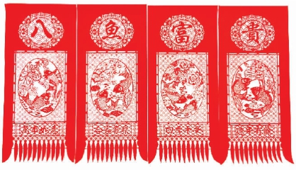 春節剪紙題材豐富,形式多樣。窗花,就是春節剪紙常見而又重要的一種。窗花的題材內容一般為花卉、獸禽、吉祥用語、戲曲故事和神話傳說,具有迎春、祈福、裝點居所的民俗功能。春節貼門箋(也叫掛箋、過門箋、紅箋、喜箋、門彩等)習俗,由古時彩勝演變而來,彩勝是用彩絹或彩紙剪的一種避邪物。 《山海經·西山經》中所載西王母頭上所戴的“勝”就是這類剪紙,“西王母其狀如人,豹尾虎齒而善嘯,蓬發戴勝,是司天之厲及五殘” 。 《后漢書·禮儀志》所記載的“青幡”也屬于此類,“立春之日,夜漏未盡五刻,京師百官皆衣青衣,郡國縣道官下至斗食令史皆服青幡幘,立青幡,施土牛耕人于門外,以示兆民,至立夏。 ”這些都是門箋的前身,其功能與立春窗花一樣,是為迎新納福之用。門箋樣式多為鏤空的錦旗形,一般貼于門楣或堂屋二梁上;圖案多為幾何紋,嵌以人物、花卉、龍鳳等,并多與“四季平安”“年年有余”等吉語組合在一起。門箋圖案一般與春聯同時使用。