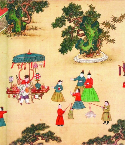 從右至左觀看,畫面第一段描繪的是明憲宗朱見深身著繡金龍袍,頭戴黑色便帽,坐在臺上的黃色帳篷中觀看太監(jiān)、童子燃放煙花爆竹的場景。畫中煙花的種類繁多,有可以如竹竿般舉著的,有可以插在地上的,有可以拿在手中揮舞的,還有可以吊著的……在畫面的右下方,還有童子從長方形的紅木箱子中拿出成串的煙花來。這些奇妙的光暈使得畫面中的所有人都沉浸在夢幻的歡愉中,而煙花的燃放也暗示了時間并非白天。透過一扇敞開宮門的紅墻,進入到了畫面的第二段,首先映入眼簾的便是一個推車、一個挑擔(dān)但都滿載貨物的貨郎。此時的憲宗直身站立在殿前石臺的右側(cè),身旁的宮人們則牽引著童子朝畫面中心早已做好了準備的貨郎及貨架走去,稍大點的孩童手中都拿著各色彩燈,有太平有象燈、馬到成功燈、蟾宮折桂燈等,無一不蘊含著美好的祝愿。在一段曲折的紅墻邊,開始了畫面的第三段,這一段中的憲宗沒有位于畫面的中心,而是位于整個畫幅的最左邊。由左向右行進,各種驚險刺激的雜??廴诵南?,伴隨著奏樂向右行進的外國使節(jié)模樣的獻寶隊伍中,領(lǐng)頭的人手牽瑞獸,其余的則多肩扛珊瑚,顯示出帝國的強盛,在節(jié)慶歡愉之外,增添了強烈的政治寓意,從而使其在民俗價值上又增加了歷史價值。他們身前的各色戲曲變裝人物則沿著紅墻,往畫面第二段走去,從而讓畫面成為一個有機互動的歡愉整體。