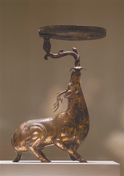 展覽中,鎏金銅象和犀牛散發(fā)濃郁的東南亞風情;裂瓣紋式樣的銀飾,透著古代波斯或羅馬文化藝術的氣息;鎏金銅當盧馬具,展示秦漢與北方草原文化的交流;劉漢造石獅的造型,帶著古代波斯和希臘文化藝術的氣息;大量寶石和玻璃器物,說明中國南方海港與南亞、東南亞等地的聯(lián)系。