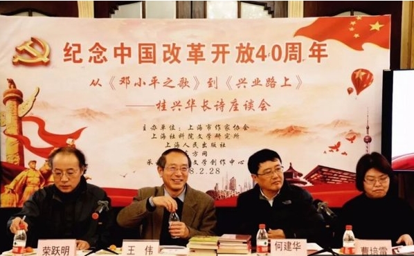 王偉(上海市作協黨組書記,副主席):為了紀念中國改革開放40周年,經過國家廣播電視新聞出版總局的審核批準,上海著名詩人桂興華先生20多年前寫作的《鄧小平之歌》今年馬上要出版新的朗誦版。同時為了迎接建黨100周年,桂先生正在創作一部長詩《興業路上》,是列入上海市重大文藝創作項目重要的作品,今天我們就圍繞這兩部作品舉行一個研討會。