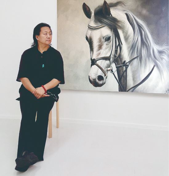 離開草原后,我投入到文學(xué)創(chuàng)作中,從《長(zhǎng)江之歌》、中國(guó)共青團(tuán)團(tuán)歌《光榮啊,中國(guó)共青團(tuán)》到中國(guó)武警主題歌《忠誠(chéng)衛(wèi)士之歌》,戎馬一生的我陰差陽(yáng)錯(cuò)地成為一名軍旅作家。歲月流逝,蟄伏于心中的駿馬情結(jié)卻依然濃烈。十多年前,我結(jié)識(shí)了青年畫家黃廣亮,他熱情、爽朗、謙遜的個(gè)性吸引了我,而他筆下的馬,更令我贊嘆不已。他畫的馬惟妙惟肖,無論奔馬、立馬、馬群都賦予了充沛的生命力。在廣亮的筆下,一匹匹駿馬奮鬃揚(yáng)蹄,挾風(fēng)而進(jìn),在廣袤的土地上飛奔。有的騰空起飛,有的蹄下生煙,有的回首顧盼,有的長(zhǎng)嘶吶喊,仿佛都要破紙而出。馬的眼睛閃閃發(fā)亮,無論你從哪個(gè)角度看,它的目光都好像在追隨著你,似有無限的眷戀之情;那挺拔的骨架像躍動(dòng)的山峰,長(zhǎng)長(zhǎng)的鬃毛似緞帶凌風(fēng)狂舞,有力的脖子若龍頸屈伸,寬闊的胸膛肌肉抖動(dòng);凸起的血管青筋,你似乎能觸摸到那種血脈僨張的力量;鋼打鐵鑄般的四肢騰挪勁健獵獵生風(fēng),仿佛一旦踏上大地,就會(huì)擂響奮進(jìn)的戰(zhàn)鼓;張大的鼻孔有若噴筒,好像吹口氣,這些馬就能打著響鼻從畫布上跑下來……廣亮畫的馬,剛勁矯健、陽(yáng)剛大氣激蕩其中,揮灑著北方人豪爽豁達(dá)、抱志不屈的天性,溶鑄成了自由奔放、宏偉壯闊、縱橫豪邁的藝術(shù)風(fēng)貌和大美境界。