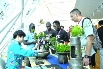 5月24日上午,來自“一帶一路”35個國家的43名青年代表齊聚南京圖書館,開啟了“2018名城會文學出版板塊文化交流參訪活動”的序幕。在南京圖書館一樓文創中心,書法表演藝術家用行書和楷書為嘉賓寫了關于南京的詩詞,展示東方文字之美,茶藝師演示了烏龍茶的泡制過程并邀請嘉賓現場品茗,花藝師用三個主枝插出的花令嘉賓贊不絕口。