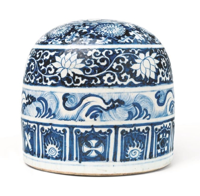 此件青花瓷“蒙古包”形器完好無損,從造型看:上半部呈半球形、下半部為圓柱體,平底,下方開有裝飾壸門的龕式小門;從裝飾看:表體施釉、白底青花為主,紋飾分五層,頂部圓心繪“穿云飛鵝”,之下依次為 “纏枝菊花”、“纏枝蓮花”、“海水卷浪”和“焰珠雜寶”。該器整體高18厘米,底部直徑18.5厘米。目前,對其時代判斷、造型詮釋、用途分析、紋飾寓意都有各種不同的理解。艾爾米塔什博物館認為 “蒙古包”形器可能燒制于1345至1355年,胎、釉、青花料和繪畫品質都很高,推斷是景德鎮為蒙元宮廷特別生產的;而彭濤先生則認為,從圖案可見,其纏枝蓮紋的蓮葉已全部是卷草紋樣式,是明初洪武的風格。但將此器的時代推定在14世紀后半葉的范圍內是大致沒有爭議的。