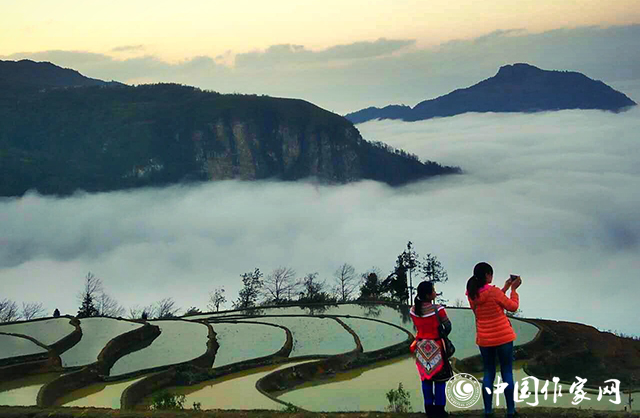 經過繁忙而喜悅的秋收之后,綿延在大山之間的梯田灌水保養,天氣也變得相對干爽和晴朗,天空因此而十分明凈。從近處、低處看,梯田中水平如鏡、波光如銀向遠方、向天邊無盡鋪展;從遠處、高處看,一條條蜿蜒婉轉的線條、一片片形態各異的塊面、一抹抹綺麗繽紛的色彩,隨著光線變化而呈現出一幅幅美不勝收的動態抽象畫,再配上恰到好處的云霧和身著艷麗民族服裝的身影,就是人間仙境的景象。