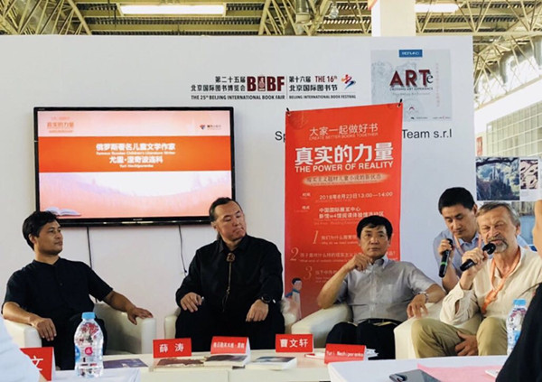 中國(guó)兒童文學(xué)作家曹文軒、薛濤、格日勒其木格?黑鶴、王璐琪,來(lái)自俄羅斯的翻譯家瑪莉婭?謝梅紐珂、插畫(huà)師葉甫根尼?波德科爾津、兒童文學(xué)作家尤里?涅奇波連科和弗拉基米爾?濟(jì)斯曼,中國(guó)文字著作權(quán)協(xié)會(huì)副總干事羅向京等參加了此次對(duì)談。活動(dòng)由接力出版社總編輯白冰主持。