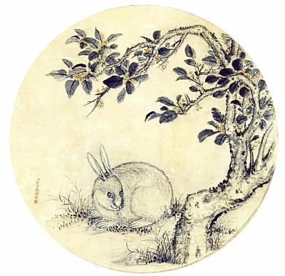 中秋之花,首推丹桂。古人仰望月空,編織出嫦娥奔月的美麗傳說。為了消解嫦娥的寂寞,又添以桂樹、玉兔的想象,使那個遙遠天際的廣寒宮多了幾分人間的冷暖情味。清代乾隆時期蔣溥繪《月中桂兔圖》,以墨筆繪圓月,月中玉兔以干筆寫皮毛,焦墨點睛,形象生動可愛。桂樹以墨筆繪枝、葉,筆法細膩老道。桂花以橘黃色點染,溫暖的色調為冷月寒宮增添了幾許暖意。全圖布局緊湊,色墨運用巧妙,極富情趣。