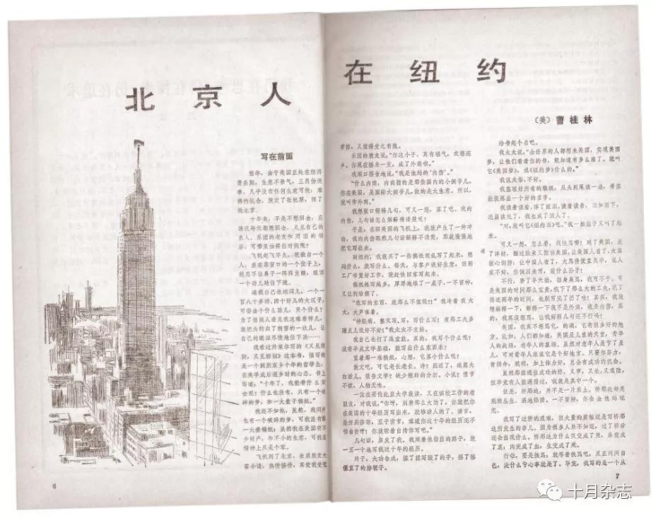 長篇小說也是《十月》的一個傳統(tǒng)。1981年的四、五兩期,連載了張潔的長篇小說《沉重的翅膀》。這是改革開放以來第一部以改革為題材的長篇小說。小說發(fā)表后雖然引起各方面的爭議甚至非常尖銳,但通過修訂后,小說獲得了第二屆茅盾文學獎;1983年四期的《十月》,發(fā)表了李國文的長篇小說《花園街五號》。小說通過一座特殊建筑發(fā)生的故事,深刻而生動地講述了政治文化與社會歷史變革的關(guān)系。那里既有刀光劍影鐵血交鋒,亦有英雄氣短兒女情長。它實現(xiàn)了作家通過小說“是想為在這場變革中,披荊斬棘,沖鋒陷陣的勇士、斗士唱一支贊歌”,“是替他們吶喊:大家來關(guān)心這場改革,支持這場改革,并且投身到這場改革洪流中來”(李國文語)的情懷和期許;1991年四期,《十月》發(fā)表了曹桂林的《北京人在紐約》。小說開啟了另外一種風尚,這種風尚可以概括為中國人在美國的成功想象。那個時代,文學界有一種強烈的“走向世界”的渴望,有一種強烈的被強勢文化承認的心理要求。這種欲望或訴求本身,同樣隱含著一種“悲情”歷史的文化背景:越是缺乏什么就越是要突顯什么。因此它是“承認的政治”的文化心理在文學上的表達。小說表現(xiàn)的是中國男人或女人在美國的成功,尤其是他們商業(yè)的成功。“中國式的智慧”在異域是否能夠暢行無阻并不重要,重要的是這些作品使中國的大眾文化在市場上喜出望外。一時間里,權(quán)威傳媒響徹著“千萬里我追尋著你,可是你卻并不在意”,來自紐約的神話幾乎家喻戶曉。作品的文學價值雖然并不高,它在文化市場的成功,為中國大眾文化的興起臨時性地添加了異國情調(diào)以及中國人的“美國想象”。
