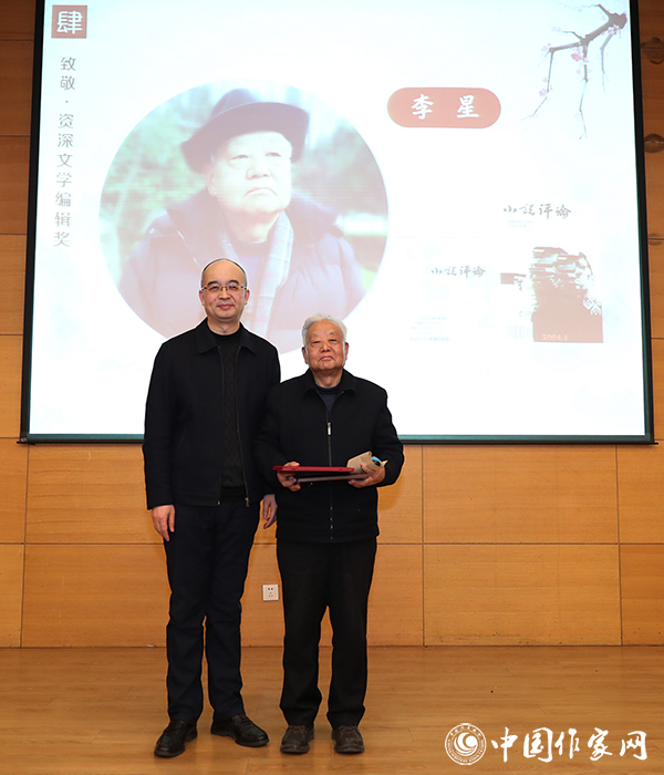 吳義勤為致敬·資深文學(xué)編輯獎(jiǎng)獲得者李星頒獎(jiǎng)