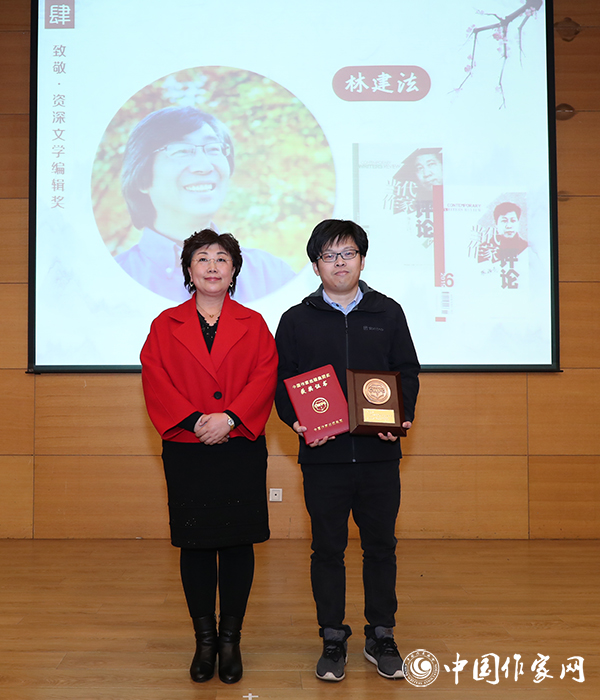 徐坤向致敬·資深文學(xué)編輯獎(jiǎng)獲得者林建法頒獎(jiǎng),編輯代為領(lǐng)獎(jiǎng)