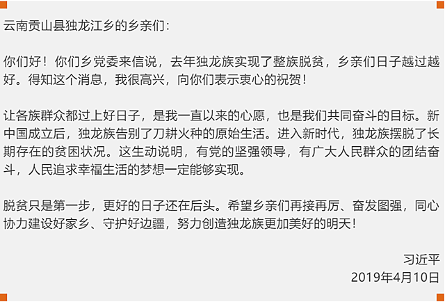 2019年獨龍族整族脫貧,鄉親們一起寫信告訴總書記這個振奮人心的好消息,習近平回信祝賀:“脫貧只是第一步,更好的日子還在后頭。”不光是獨龍族,習近平在信中還表達了對各民族的熱切關心,“讓各族群眾都過上好日子,是我一直以來的心愿,也是我們共同奮斗的目標。”