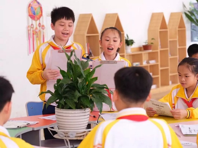 來自靖西第三小學的何瑞翔、鐘瑾涵兩位同學,率先朗誦了一首《春天的腳印》