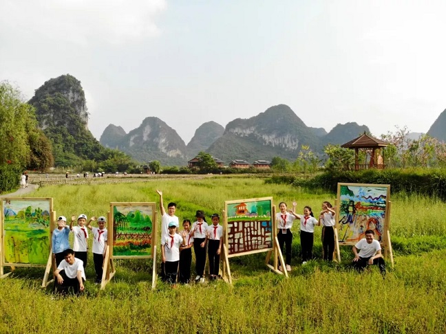 而以張杰為首的藝術家們,則為孩子們帶來了一堂主題為“美從何處尋”的藝術課。張杰在課堂上與孩子們交流生活中最美的人、事、夢等意象,引導孩子們用藝術的眼光去觀察生活,感受身邊的愛與美,并發揮聯想能力,將心中的“最美”以繪畫的形式還原出來。在課堂內容結束后,藝術家們領著孩子們前往聞名靖西的風景點鵝泉,進行藝術課的“實戰演練”。