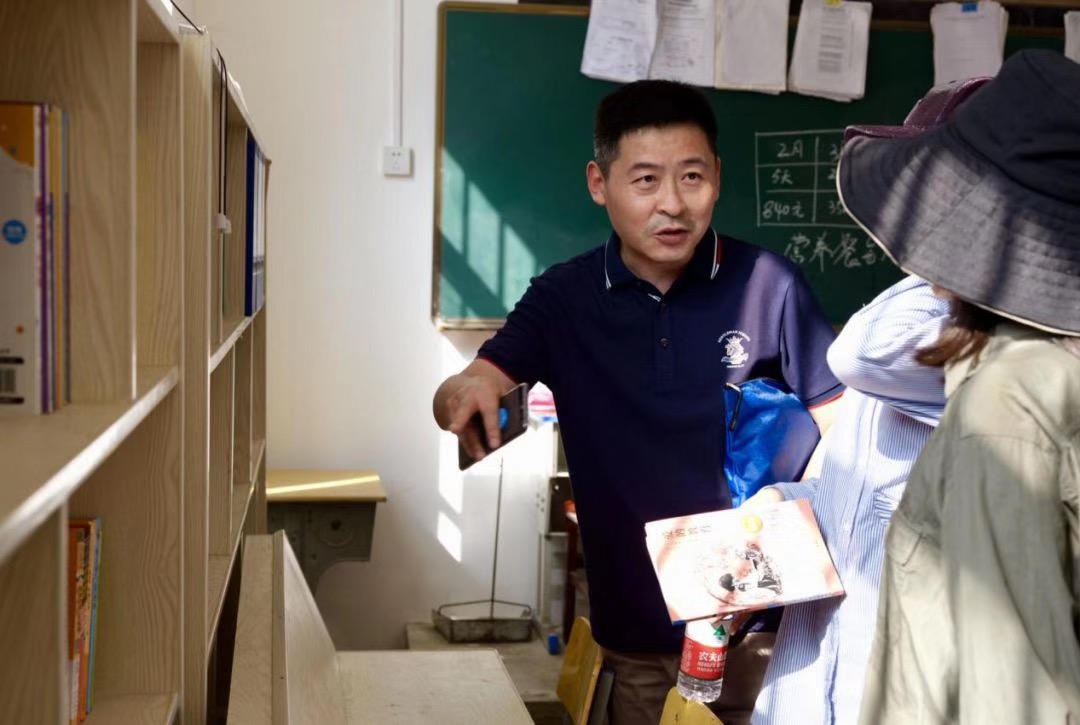 在大莫村弄關民族小學圖書室,與扶貧采風團探討鄉村教育發展的中華文學基金會副秘書長安亞斌 攝影:趙衛國
