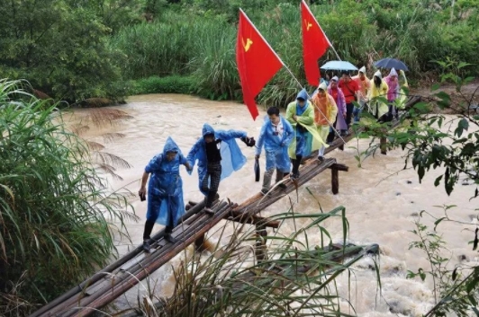 2019年6月11日至8月18日,中央宣傳部組織開展了“壯麗70年·奮斗新時代——記者再走長征路”主題采訪活動,先后有1300余名記者追隨當(dāng)年紅軍長征步伐,深入實地采訪,累計跨越16000余公里,推出10000余篇鮮活生動、形式多樣的報道,網(wǎng)上總閱讀量近20億次。習(xí)近平總書記近日對“記者再走長征路”主題采訪活動作出重要指示強(qiáng)調(diào),中央宣傳部組織開展的“記者再走長征路”主題采訪活動,生動再現(xiàn)壯懷激烈、驚天動地的革命故事,對闡釋用生命和鮮血鑄就的偉大長征精神很有意義。圖為6月13日,參加主題采訪活動的記者們,在江西于都縣祁祿山沿著當(dāng)年中央紅軍長征走過的“紅軍小道”冒雨行進(jìn),體驗紅軍穿越深山峽谷的艱苦行程。經(jīng)濟(jì)日報記者 劉興/攝