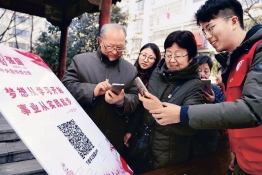 建設(shè)“學(xué)習(xí)強(qiáng)國”學(xué)習(xí)平臺,是貫徹落實習(xí)近平總書記關(guān)于加強(qiáng)學(xué)習(xí)、建設(shè)學(xué)習(xí)大國重要指示精神、推動全黨大學(xué)習(xí)的有力抓手,是新形勢下強(qiáng)化理論武裝和思想教育的創(chuàng)新探索,是推動習(xí)近平新時代中國特色社會主義思想學(xué)習(xí)宣傳貫徹不斷深入的重要舉措。該平臺自2019年1月1日上線以來,極大地滿足了互聯(lián)網(wǎng)條件下廣大黨員干部和人民群眾多樣化、自主化、便捷化的學(xué)習(xí)需求。圖為2019年2月25日,江蘇科技大學(xué)志愿者在指導(dǎo)老黨員掃描二維碼安裝“學(xué)習(xí)強(qiáng)國”手機(jī)APP。人民圖片供圖 石玉成/攝