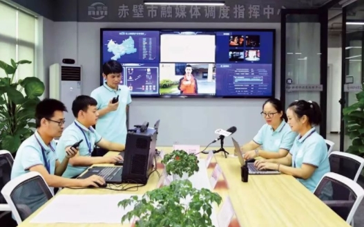 做好新時代宣傳思想文化工作,重點在基層,關(guān)鍵在創(chuàng)新。建設(shè)縣級融媒體中心,是打通基層宣傳思想文化工作到達(dá)群眾“最后一公里”的重要探索。圖為2019年5月19日,湖北赤壁市組織開展“新時代文明實踐 你我同行”活動,“云上赤壁”全程手機(jī)直播,赤壁市融媒體指揮調(diào)度中心對直播活動進(jìn)行調(diào)度指揮。黃富清/攝