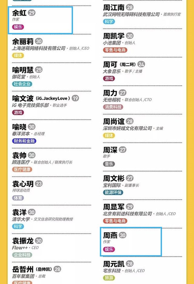 10月17日,福布斯中國公布了最新的30歲以下精英榜(30 Under 30),選出了600位30歲以下活躍在中國的創業和行業創新者。今年的青年精英有來自體育行業的女排主力袁心玥、馬術運動員華天,娛樂領域的陳飛宇、春夏等,以及眾多青年科學家和商業開創者。令人驚喜的是,網絡文學領域中也首次有兩位作家榮登精英榜,分別為閱文集團旗下白金作家余虹(筆名亂)和周燕(筆名囧囧有妖)。