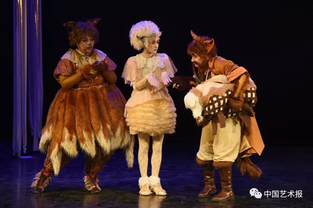 原著本身的厚重感不免會讓這個劇帶上沉重的色彩,這與少兒觀眾喜歡熱鬧、活潑產生了矛盾,但該劇將人物轉化為動物的同時,還巧妙地運用動物形象和動作的特點讓演出充滿著詼諧和幽默。劇中主教的管家瑪格魯瓦爾太太是一只鴨子的形象,她的一驚一乍和小市民的氣質,被演員戴曄用鴨子搖擺的行動姿態、呱噪的語言來塑造,形成了這個人物特有的趣味性,符合了兒童觀眾的喜好。德納第夫婦狐貍一家被演員們用夸張放大的表演手法,賦予了人物喜劇的色彩,總是讓人忍俊不禁。