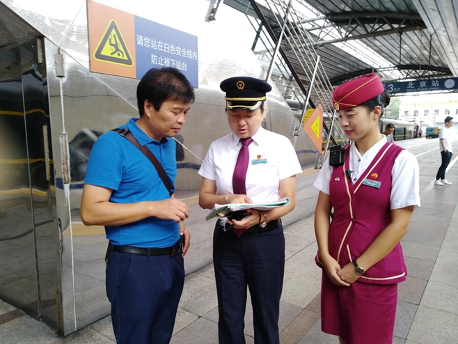作家黃開建在北京站站臺上采訪高鐵列車員和車隊領導