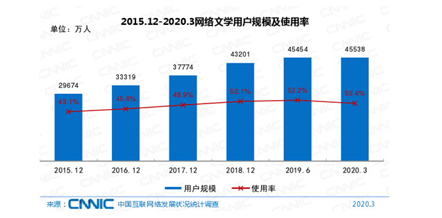 截至2020年3月,我國網絡文學用戶規模達4.55億,較2018年底增長2337萬,占網民整體整體的50.4%;手機網絡文學用戶規模達4.53億,較2018年底增長4238萬,占手機網民的50.5%。