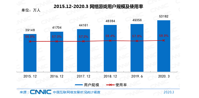 截至2020年3月,我國網絡游戲用戶規模達5.32億,較2018年底增長4798萬,占網民整體的58.9%; 手機網絡游戲用戶規模達5.29億,較2018年底增長7014萬,占手機網民的59.0%。