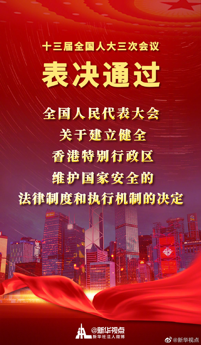 新華社北京5月28日電 5月28日下午,十三屆全國人大三次會議以高票表決通過《全國人民代表大會關于建立健全香港特別行政區維護國家安全的法律制度和執行機制的決定》。