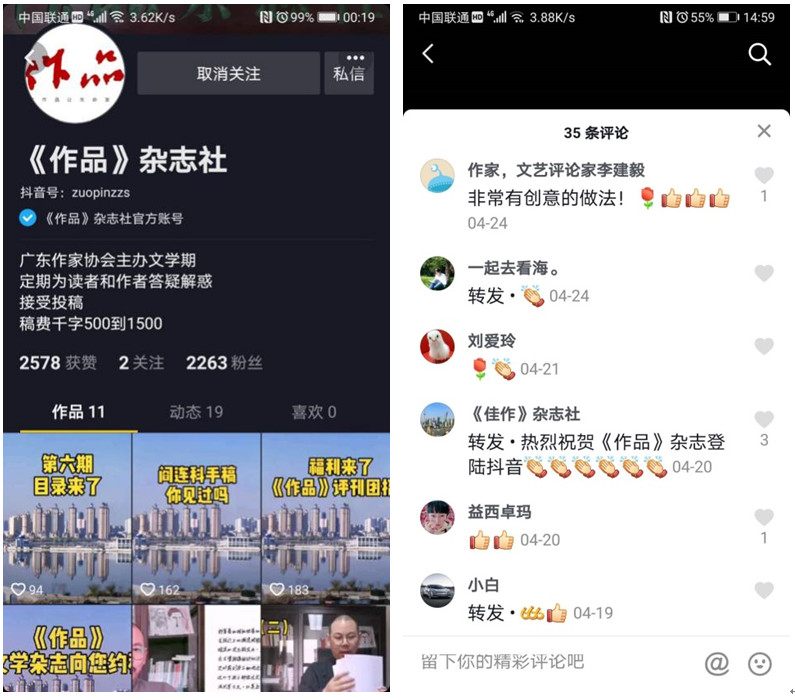 自2020年4月入駐抖音APP以來,《作品》雜志社官方號共發布作品11條,視頻內容均為介紹當期刊發作品、展現編輯工作日常、賞讀知名作家手稿,獲贊數和粉絲數均有兩千余。刊物負責人王十月用個人抖音號試水,也收割了6萬獲贊,1.6萬粉絲,成為了一名小小“文學”網紅。王十月說,自己本以為抖音上的年輕人會喜歡金庸,但沒想到文學的流行面孔早已革新,新一代年輕人對武俠小說興趣有限,對網絡文學認同感更高,“你要是膽敢在抖音上說一句《雪中悍刀行》不好看,至少能有十萬的播放,不過他們不會給你點贊”。王十月發現,新一代年輕人的認知已經和“70后”的自己有著極大的差別,自己對年輕人的所思所想知之甚少,做抖音能倒逼他按照年輕人的想法思考,也能讓刊物的內容最大限度地被更多讀者熟悉。按照抖音短視頻的運行機制,要在20秒內將核心的內容提供給用戶,撰寫抖音文案時,他發現自己以前的寫作廢話太多,“要按照抖音文案的標準,一篇文章最后留下的就是精彩的東西”。