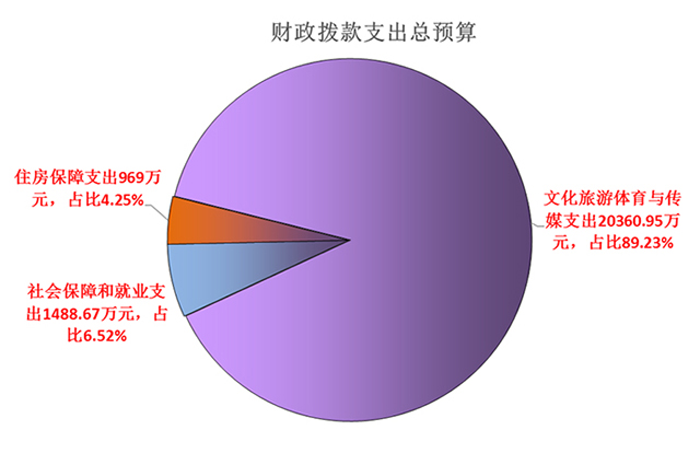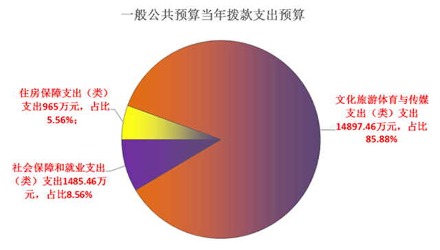 文化旅游體育與傳媒支出(類)支出14897.46萬元,占比85.88%;社會保障和就業支出(類)支出1485.46萬元,占比8.56%;住房保障支出(類)支出965.00萬元,占比5.56%。