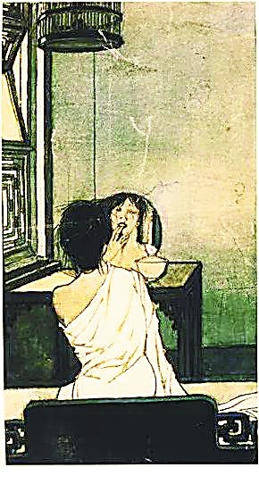 聞一多除了擅長書籍封面設(shè)計外,亦精于書刊的插圖設(shè)計。1927年,他為潘光旦的書稿《馮小青考》(后改名為《小青之分析》《馮小青:一件影戀之研究》),創(chuàng)作了一幅名為《對鏡》的水彩畫插圖。馮小青是生活在明代萬歷年間的一位才貌雙全的女子,因婚姻不幸最終抑郁而死。畫面上,聞一多借鑒19世紀末西方新美術(shù)主義設(shè)計風格,勾勒了主人公身披睡衣、以背示人、對鏡梳妝的背影,同時巧妙地借助梳妝臺上的圓鏡,映襯出她散亂的發(fā)鬢間,娥眉微蹙,眼神憂悒,面容憔悴的形象。畫面的左上方,懸掛著一只鳥籠,預(yù)示了人物的悲劇命運。整幅作品從一個側(cè)面,折射了聞一多積極倡導并身體力行的“中西會通,古今融合”的美學理念。
