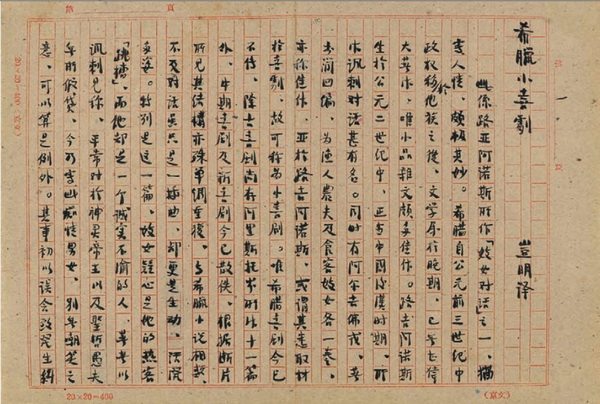 周作人早年留學日本,通曉日文、英文、 希臘文等多種文字,他十分看重日本文學和古希臘文學。日本文學自不必贅言,上述諸多手稿內容中可見周作人總頻頻提及日本。而周作人的希臘文學譯作也有二百萬言,大多為晚年完成的。他說:“余一生文字無足稱道,唯暮年所譯希臘對話是五十年來的心愿,識者當自知之。”這批手稿中,如《希臘小喜劇》《愛說誑的人》《塔伊斯與格呂刻拉》都是與希臘文學歷史相關。