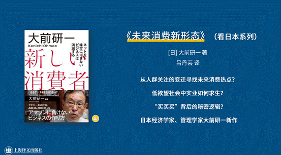 日本觀察方面,日本經(jīng)濟(jì)學(xué)家、管理學(xué)家大前研一的又一日本觀察力作《未來消費(fèi)新形態(tài)》將于今年與讀者見面。作為《低欲望社會》的姊妹篇,大前研一在該書中基于敏銳的社會透視,提出日本“低欲望社會”形勢下的新經(jīng)濟(jì)對策。他提出了“不能善用網(wǎng)絡(luò)的商家將退出歷史舞臺”,分析了經(jīng)濟(jì)形勢下出現(xiàn)的新問題:急速增長的共享經(jīng)濟(jì)、偶像經(jīng)濟(jì)、從物品消費(fèi)向體驗消費(fèi)的轉(zhuǎn)變等。