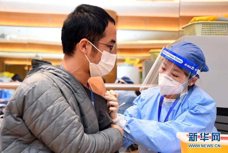 2月22日,在北京市海淀區中關村軟件園二期一家企業內的臨時接種點,醫務人員為企業員工接種新冠疫苗。新華社記者 任超 攝