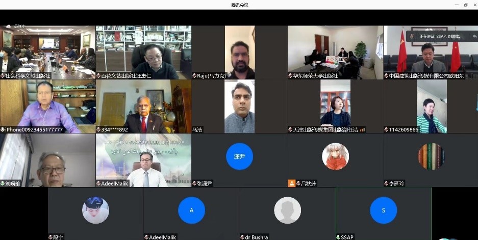 隨后,社科文獻出版社國際出版分社社長李延玲、百花文藝出版社總編輯汪惠仁、中國建筑出版?zhèn)髅接邢薰靖笨偨?jīng)理歐陽東、華東師范大學(xué)出版社副社長龔海燕分別向大家介紹了各社烏爾都語圖書的出版情況,并在線舉行多種圖書的簽約儀式。其中,社會科學(xué)文獻出版社的《中國崛起與亞洲地區(qū)市場建構(gòu)》烏爾都語版,百花文藝出版社的《海邊春秋》烏爾都語版,華東師范大學(xué)出版社的《華東師大版一課一練 數(shù)學(xué)》烏爾都語、英語版,中國建筑出版社的《文人園林建筑》烏爾都語版等多本圖書均與巴基斯坦出版社及譯者實現(xiàn)了簽約。