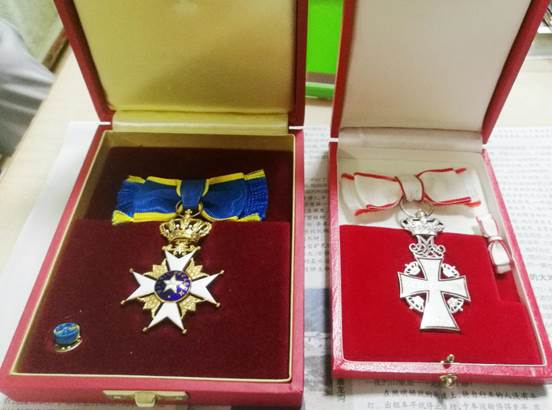 左:2017年石琴娥獲得瑞典皇家北極星勛章。右:2010年,為了表彰石琴娥的貢獻,丹麥王儲在上海世博會丹麥館向石琴娥頒發了丹麥國旗騎士勛章。