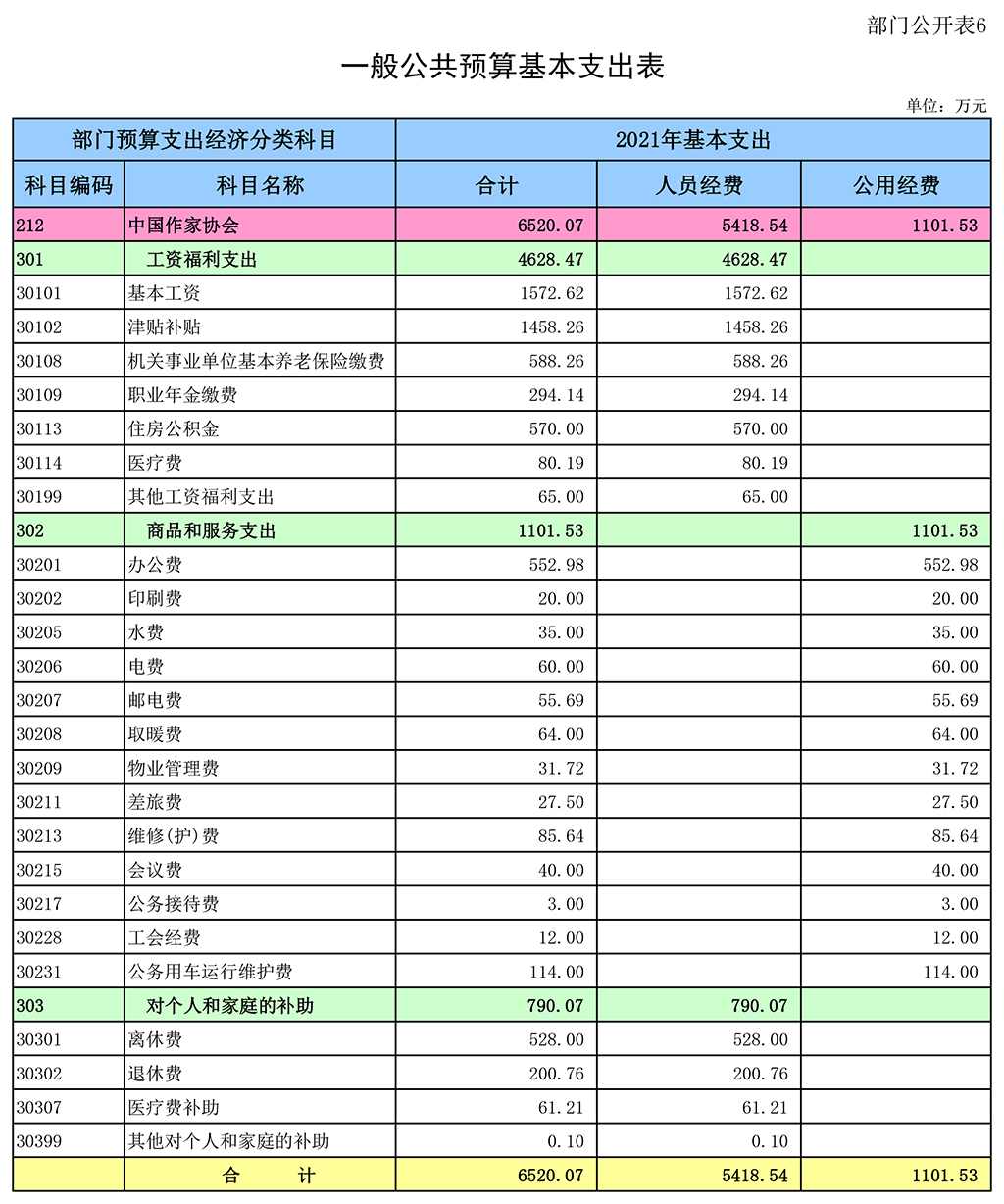 中國(guó)作家協(xié)會(huì)2021年一般公共預(yù)算基本支出6520.07萬(wàn)元,其中:
