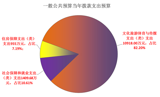 文化旅游體育與傳媒支出(類)支出10918.00萬(wàn)元,占比82.20%;社會(huì)保障和就業(yè)支出(類)支出1409.68萬(wàn)元,占比10.61%;住房保障支出(類)支出955.00萬(wàn)元,占比7.19%。