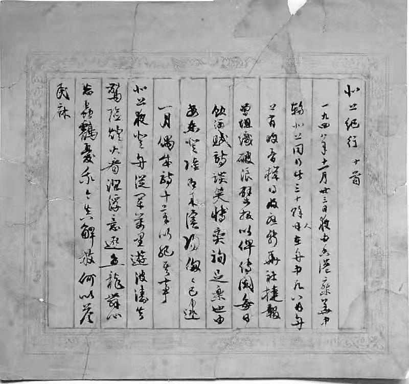 《北上紀行》手稿共4頁,每頁約一尺見方,由郭沫若用毛筆行草書就,紙面已經泛黃,部分邊緣有破損。十首詩記錄了郭沫若北上時的所見所聞所感所悟,雖名為記事,實則抒情。落款的時間為“一九四九年元旦后五日書奉”,這是民主人士北上沈陽的時間。