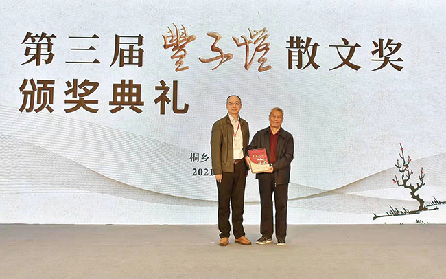 中國作協黨組成員、書記處書記吳義勤向第三屆豐子愷散文獎特別獎獲得者梁衡頒獎。