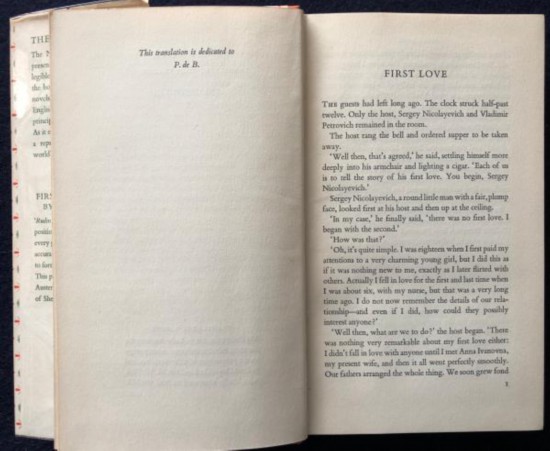 伯林英譯的《初戀》(First Love),1950年由倫敦哈米什·漢密爾頓(Hamish Hamilton)出版,與另一位(Alec Brown)英譯的《羅亭》(Rudin)合為一冊,戴維·塞西爾爵士(Lord David Cecil)撰序。