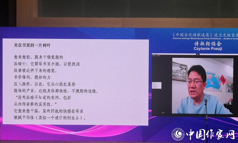5月18日下午,由中國作家協會、中國駐波蘭大使館、波蘭對話出版社共同主辦的《中國當代詩歌選集》波蘭文版首發式暨詩歌朗誦會在北京紅樓公共藏書樓以線上線下結合的方式舉行。中國作協副主席、書記處書記吉狄馬加,中國駐波蘭大使館文化參贊張中華出席活動并致辭。中國詩人湯養宗、胡弦、陳先發、張執浩與本書譯者,波蘭漢學家、翻譯家李周、卡塔基娜·薩雷克,波蘭對話出版社總經理安德烈·帕西米斯等通過視頻連線方式共襄詩歌盛會。朗誦會由中國作協外聯部負責人張洪斌主持。