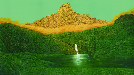 近年來,在我為大興機場創作的油畫《新輝煌》中,這種創作觀念就體現得更加典型。這幅作品中,我用一個具象的表現高原雪山在陽光下呈現金色光芒的那種神圣的、瞬間的人間仙境似的畫面,把習近平總書記的“綠水青山就是金山銀山”的思想表現出來了。“金山銀山”對應著大自然最美的景觀,綠色又代表著一種蓬勃向上的生命力。這樣一幅畫的創作靈感來自當年我在西藏的親身體驗,也來自一個畫家多年來對藝術創作的深度思考。