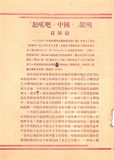 他所收集來的演出說明書中,有些劇目對當(dāng)時的歷史和戲劇都提供了珍貴的研究價值。比如《怒吼吧!中國》是上世紀(jì)30年代左翼戲劇的一部重要作品,由蘇聯(lián)詩人特力雅可夫根據(jù)英美軍艦在四川萬縣迫害中國百姓的真實(shí)事件改編。他以詩的形式寫作,后由上海戲劇協(xié)會搬上舞臺。但在日軍占領(lǐng)上海后,當(dāng)局為動員民眾將其改編為《江舟泣血記》。《江舟泣血記》演出說明書顯示,該劇曾在大光明戲院組織了演出。上海解放后,人民政府組織的第一次大規(guī)模演出也正是此劇,演出地點(diǎn)在文化廣場。