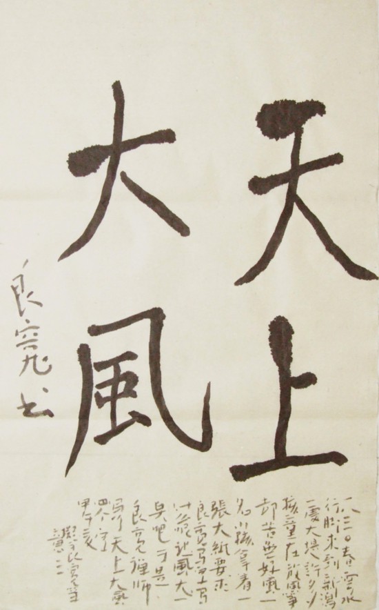 良寬生前有許多被人津津樂道的趣事。這些小故事顯示了良寬的愚與真,樸拙與童心,也展現了他對兒童、庶民,對貧弱者,對花草樹木的愛。他每天早上對著天空無紙練字,或者在土和沙上寫字。用寶貴的紙練習時會練到紙全然漆黑。許多富人或相識者向他索字,良寬未必有求必應,但他卻樂于為孩童寫字。據說有一次良寬在燕市乞討完后,在大堤上見一群小孩準備放風箏。有個小孩拿著一張紙走來對他說“請幫我寫字”,良寬問他要做什么,小孩說“我要做個風箏,請幫我寫‘天上大風’”,良寬欣然提筆,為這孩子寫下“天上大風”四個字。