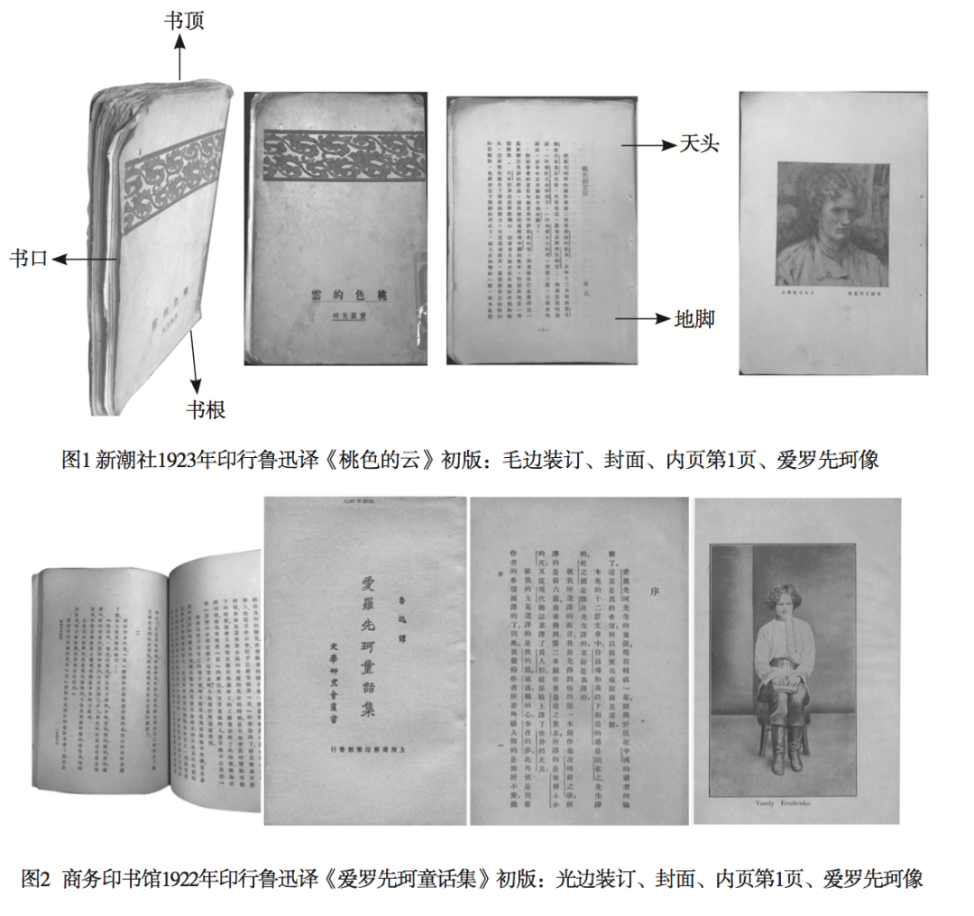要達(dá)到最佳效果,“新潮社文藝叢書”毛邊本依靠的不僅是裝幀與版式設(shè)計(jì),同樣還需要令設(shè)計(jì)得以實(shí)現(xiàn)的物質(zhì)與技術(shù)基礎(chǔ)。可以說,“新潮社文藝叢書”利用了其時(shí)最精良的機(jī)械印刷條件。在紙墨方面,周氏兄弟留日時(shí)便已注意到歐式及日式毛邊本的封面多用皮革燙金或布面軟精裝,內(nèi)頁(yè)墨勻紙潔,編印《域外小說集》時(shí),就曾盡力模擬其質(zhì)感,用仿呢布質(zhì)地的厚羅紗紙做書面,用“上好洋紙”印本文,自謂“印的特別考究”6。“新潮社文藝叢書”沿襲此制,封面用仿布質(zhì)的重磅木造紙或布紋紙,插圖用銅版紙,內(nèi)文不再采用國(guó)內(nèi)通行的質(zhì)地脆弱、易氧化發(fā)黃的低價(jià)白報(bào)紙,而全部使用潔白光滑、不易變色、印字均勻的較高價(jià)道林紙。在印刷方面,“叢書”拼貼式地采用了其時(shí)最新穎的印刷技術(shù)。在同北京各印廠充分商討價(jià)格、理解技術(shù)后,李小峰等幾個(gè)新潮社員選定了京華印書局。作為商務(wù)印書館在北京設(shè)立的印刷所,1921年京華印書局大增設(shè)備后,躍升為北京30多處印廠中規(guī)模最大,技術(shù)最新,制版最精也是價(jià)格最昂貴的一個(gè)7。而魯迅為精益求精,又委托商務(wù)印書館上??倧S制三色版《桃色的云》作者像8。這里不妨與1922年商務(wù)印書館出版《愛羅先珂童話集》做一比較,同為愛羅先珂作品翻譯集,商務(wù)版作者像即為單色版照片,這是當(dāng)時(shí)文集插圖的標(biāo)配,三色版雖然清晰度高,但成本較單色或普通鋅版高出三倍至四倍,多用于畫冊(cè)、票鈔等,此前很少用于文集(《桃色的云》與《愛羅先珂童話集》形制對(duì)比見圖1、圖2)。