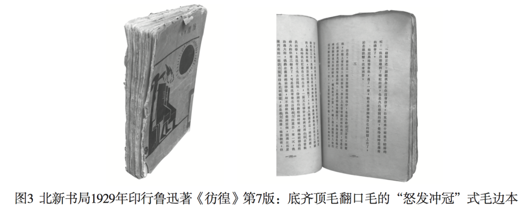 與西方前現(xiàn)代閱讀經(jīng)驗(yàn)的汲取相應(yīng),另一個(gè)值得注意的史實(shí)是,周氏兄弟引入的毛邊本形制并非一成不變,其本土化過程中也帶入了周氏兄弟等人來自本國(guó)傳統(tǒng)的閱讀感覺?!懊咟h”唐弢先生曾就自己的藏書做過一番有趣的考據(jù):“新潮社文藝叢書”的一系列出版物,將書頂紙張切光,不裁切書口與書根折疊的紙張,即保持毛邊在書口與書根。到1920年代中期北新書局從新潮社徹底分離后,毛的一邊漸漸移到書頂,反而將書根紙張切光,毛邊在書口與書頂,對(duì)于這種書頂毛邊,魯迅曾比喻為人的頭發(fā)17,所謂“底齊頂毛翻口毛”,成為北新毛邊本的標(biāo)準(zhǔn)制式,并影響了中國(guó)文藝書的裝幀18。