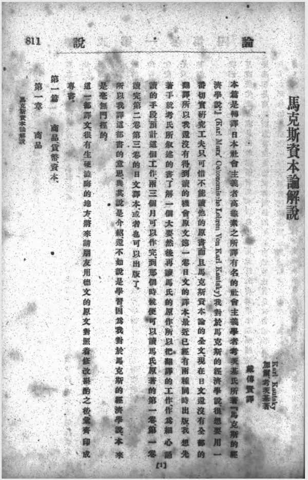 值得一提的是,擬作為《資本論解說》附錄一的《馬克斯傳》(威廉·里布列希著,戴季陶譯),已發表于1920年1月1日出版的《星期評論》第31號(新年號)。戴季陶是以1906年日本出版的《社會主義研究》第一號所載志津野又郎譯本為主,并參照1919年《批評》所載的室伏高信譯本而轉譯。(威廉·里布列希著、戴季陶譯《馬克斯傳》,《星期評論》第31號,1920年1月1日出版)而考茨基原著的《資本論解說》,則是1919年至1920年間,戴季陶與朱執信、李漢俊分別合作,轉譯自日本高畠素之1910年的日譯本初版,在1919年11月1日出版的《建設》雜志第1卷第4號開始刊載,之后分別是第1卷第5-6號,第2卷第2-3號、第5號,直至1920年12月1日出版的第3卷第1號,共連載七期。后來由胡漢民補譯并作校訂,于1927年由上海民智書局出版。(考茨基著,戴季陶、朱執信、李漢俊、胡漢民譯《資本論解說》,戴季陶序一、胡漢民序二,上海民智書局1927年版)這個正式出版的版本,自然沒有了1920年計劃中的《共產黨宣言》等附錄。